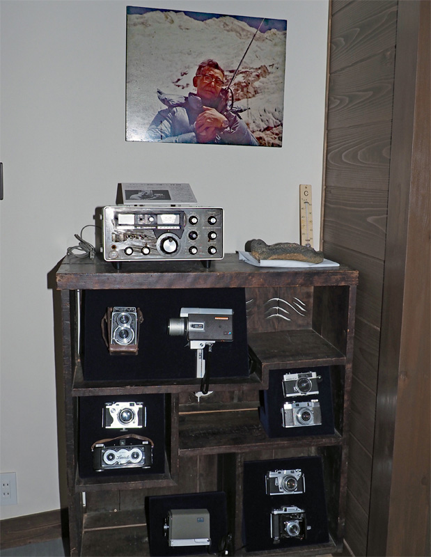 別の壁を見ると、ネパールで大きなトランシーバー(ソニーのCB機)で交信する西堀さんの写真が掲げられ、その下にはネパールに持参した真空管式の無線機や、記録用のカメラ、8mm映画のカメラなどが展示されていました!!