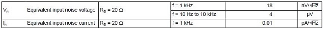 下の2行は今まで見てきたオペアンプのデータシートにはない項目で、“Input current noise density”(入力換算電流雑音密度)があります。単位は電圧と異なり、“pA/√Hz”となっています。