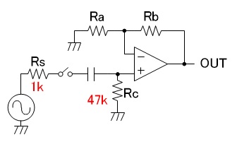 信号源のインピーダンスを1kΩとすると、信号源をつないだ時(回路図のSWがON)はオペアンプの入力には1kΩと47kΩを並列接続した抵抗値に相当するノイズが入力されます。しかし、信号源を取り外す(SWがOFF)と抵抗からのノイズは47kΩの抵抗値のノイズレベルになります。なお、ここでは結合コンデンサの容量は十分に大きく低周波まで通過することを前提としています。また、マイナス入力端子の抵抗からのノイズは無視しています。