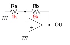 更に下図のゲイン10倍の非反転アンプ回路の抵抗からのノイズを考えてみます。やはりオペアンプのノイズはないものとします。