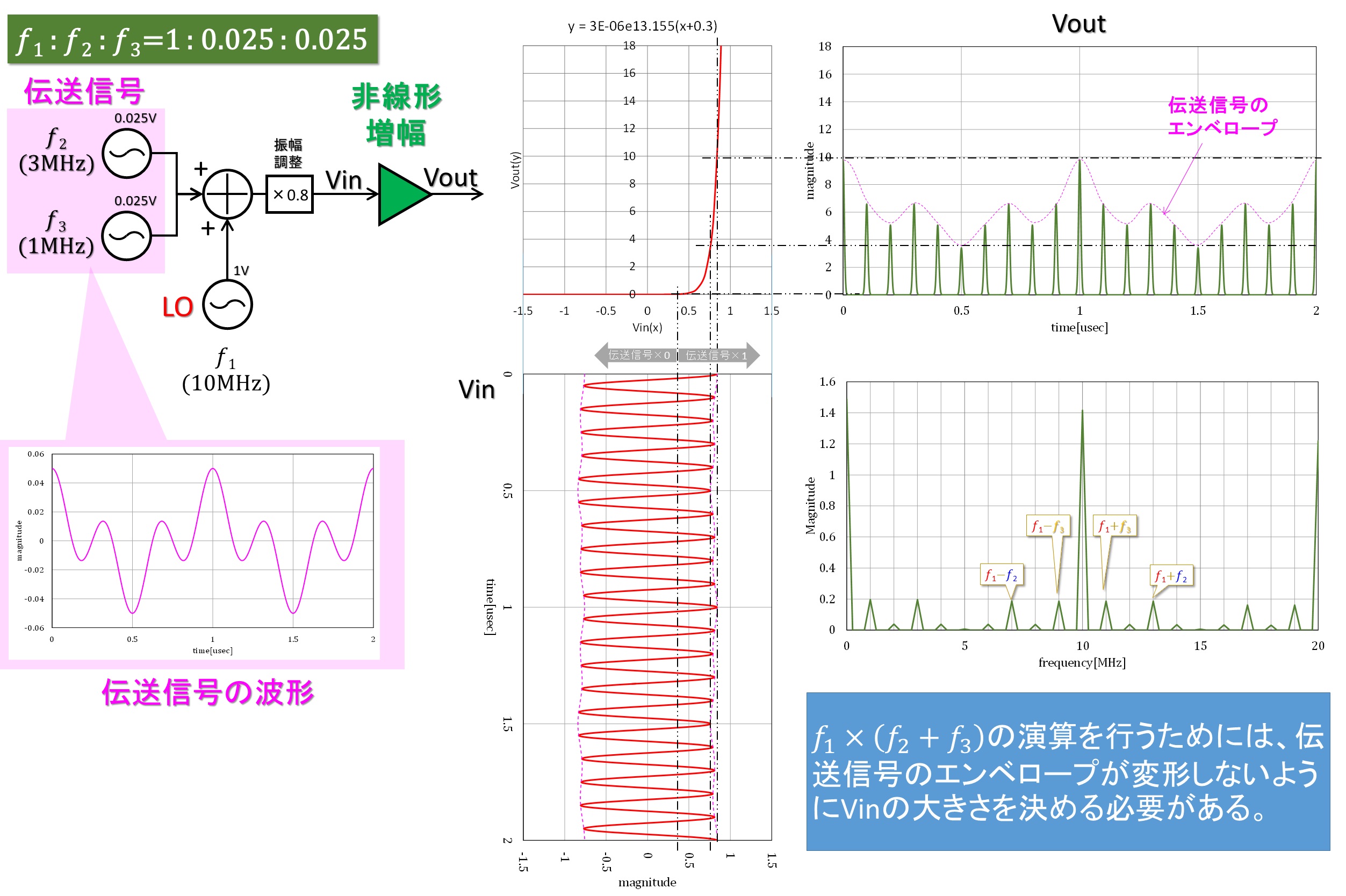実際の周波数変換回路では、伝送信号のスペクトル同士が掛け算されることを防ぐために、LOと伝送信号の間に大きなレベル差(振幅差)を設けています。伝送信号とLOのレベル差が掛け算処理にどう関係するのかを図5~図7を使って解説します。伝送信号は様々な周波数のサイン波が様々な位相差で合成された信号なので複雑な波形になります。図5~図7では図3,図4と同様、𝑓2=3MHz,𝑓3=1MHzの所謂2トーン信号を例にしていますが、図5~図7の左側の吹き出しに示したように、2波であっても時間波形は複雑な振幅になります。LO信号𝑓1が伝送信号𝑓2+𝑓3よりも大振幅であれば、非線形増幅の出力信号のエンベロープには伝送信号波形の形が現れます。このエンベロープの形が伝送波形に近ければ近いほど、出力波形は𝑓1×(𝑓2+𝑓3 )に近く(図5)、エンベロープに現れる伝送波形の形状が歪んでいるほど、出力波形は𝑓1×𝑓2×𝑓3に近づきます(図6~7)。Vin波形に現れる伝送信号の振幅が、非線形増幅器の非線形性の強い領域にかからないように、LO信号の振幅がバイアスの機能を果たしていることが、図5のグラフからお解り頂けると思います。これがLO信号の振幅が大きいと出力エンベロープが伝送波形に近づく理由です。