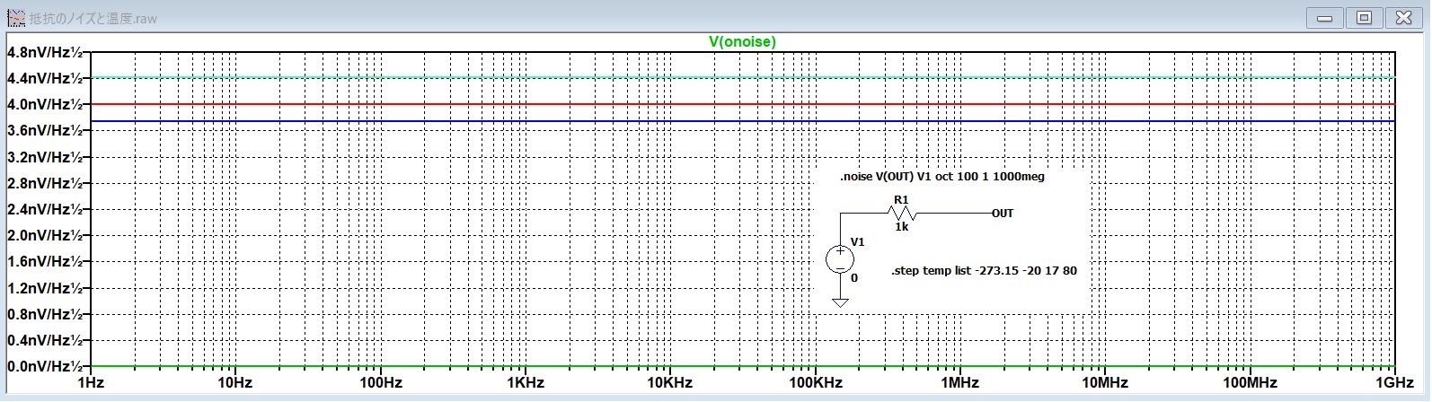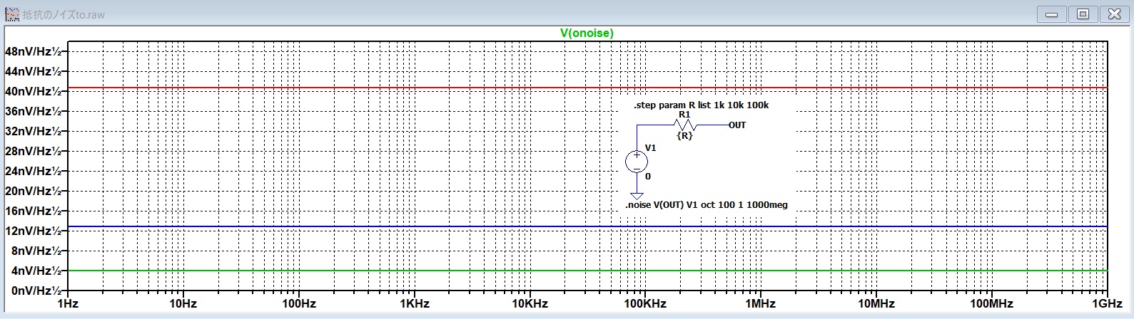 シミュレーションでは抵抗値を1kΩ(緑線)、10kΩ(青線)、100kΩ(赤線)と変化させています。ウソかマコトか、1Hzから1GHzまで見事に電圧雑音密度がフラットです。線がギザギザでなく直線なのでノイズらしく見えませんけど、、。