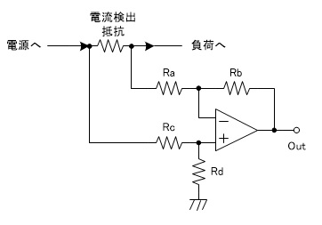 電流検出回路は図のように、電流検出用の抵抗を電源ラインに入れ、電流が流れることで生じる抵抗の両端の電位差を差動アンプで増幅します。この場合、電源電圧が変動しても出力にはその変動が現れません。この回路では電流が流れることで生じる電流検出抵抗の両端の電位差が差動アンプの入力電圧になります。通常、電流検出用の抵抗はRa~Rdの抵抗値に比べて十分に小さいので、差動アンプの入力電圧は先に示したようにRb/Ra倍されてOut端子から出力されます。