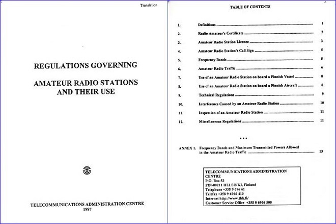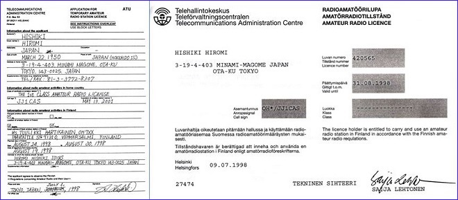 JJ1CAS菱木ひろみさんは、フィンランドの免許を得て運用したと、多くの参考資料を添えて、アンケートを寄せてくれた(写真1及び2)。「JARL指導の、無線従事者免許証と無線局免許状の英文証明を添付する取得方法に従って、OH/JJ1CASの免許を取得しました(JARLに申請の仕方の説明書が用意されています)。申請先はTelecommunications Administration Centre, P. O. Box 53, SF-00211 Helsinki, Finland になっています。別の記載には運用開始希望日の2ヶ月以上前にSARL(フィンランドアマチュア無線連盟)へ提出するとなっていますが、私は、一応前者に送り、e-mailにてOH7XX, Tuulikkiに連絡をとり、彼女から担当者が夏休みに入る前に書類の確認、また申請をお願いして頂きました。