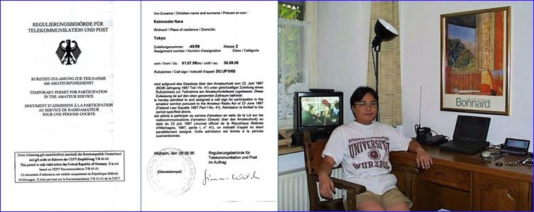 JP1HIS奈良圭之輔氏は、ドイツ滞在から帰国して半年以上が経過したと、夏にはまたドイツに行って運用しようと短期免許をとった事を、手紙で知らせてくれた(写真7)。「帰国して半年以上も経つと、すっかりまた元の自分に戻ってしまうものですね。ここ数ヶ月は学部学生の指導や、アルバイトの病院当直にあけくれ、家にあまり帰らない日々が続いております。当然ながらOn Air出来ずに苦しい日々でもありますHi。その分、夏のDLでは思いきり144~1200MHzまでのFMで運用して来ようと思っております。運用及び現地でのアイボール関しては、別にレポートを送る事にして、今回は再度DLで短期免許を取得しましたので、そのコピーをお届致します。どうも短期免許の規定が変更されたのか、先方の手違いなのか、コールサインが4アマ相当のDC/JP1HISになっていたのが気にかかりますが、運用がV・UHFのFMなので、今回は何の問題もありません。(1998年6月記)」