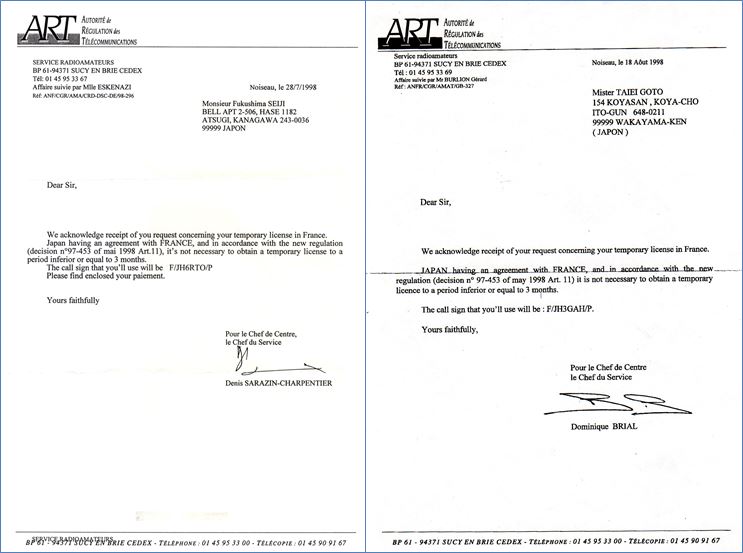 (右)フランス当局から、F/JH3GAH/P後藤太栄氏へのレター。