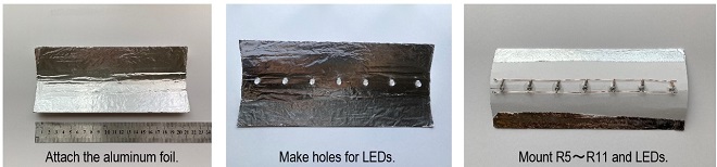 I made holes in the cardboard for the number of LEDs and insert them from the rear. Fix the LEDs to the cardboard with adhesive after insertion. Also, solder resistors R5 to R11 (680 Ω) as shown in the circuit diagram.