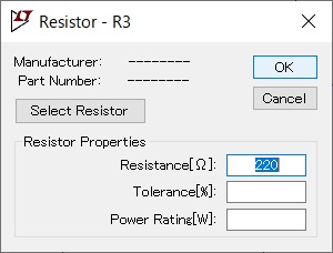 これはR3の定数を入力する画面です。一番上のResistance(抵抗値)の部分だけに値を入力すれば良く、下の2つは空のままでもOKです。コンデンサなども同様で、容量の部分だけ入力すればOKです。