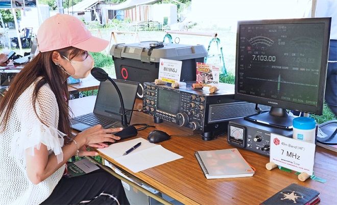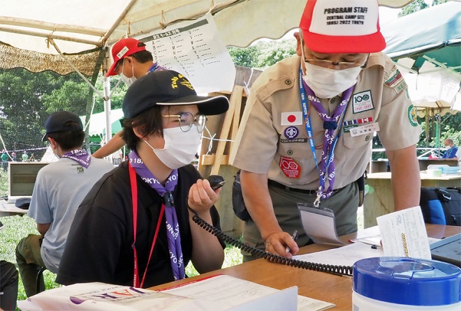 「JH1CBXポータブル1、応答ありがとうございます。こちらは8N18NSJ。日本スカウトジャンボリーの体験局 特設局です。ただいま体験運用をしておりますので、体験者との交信をお願いします」というアナウンスに続いてマイクを交代!