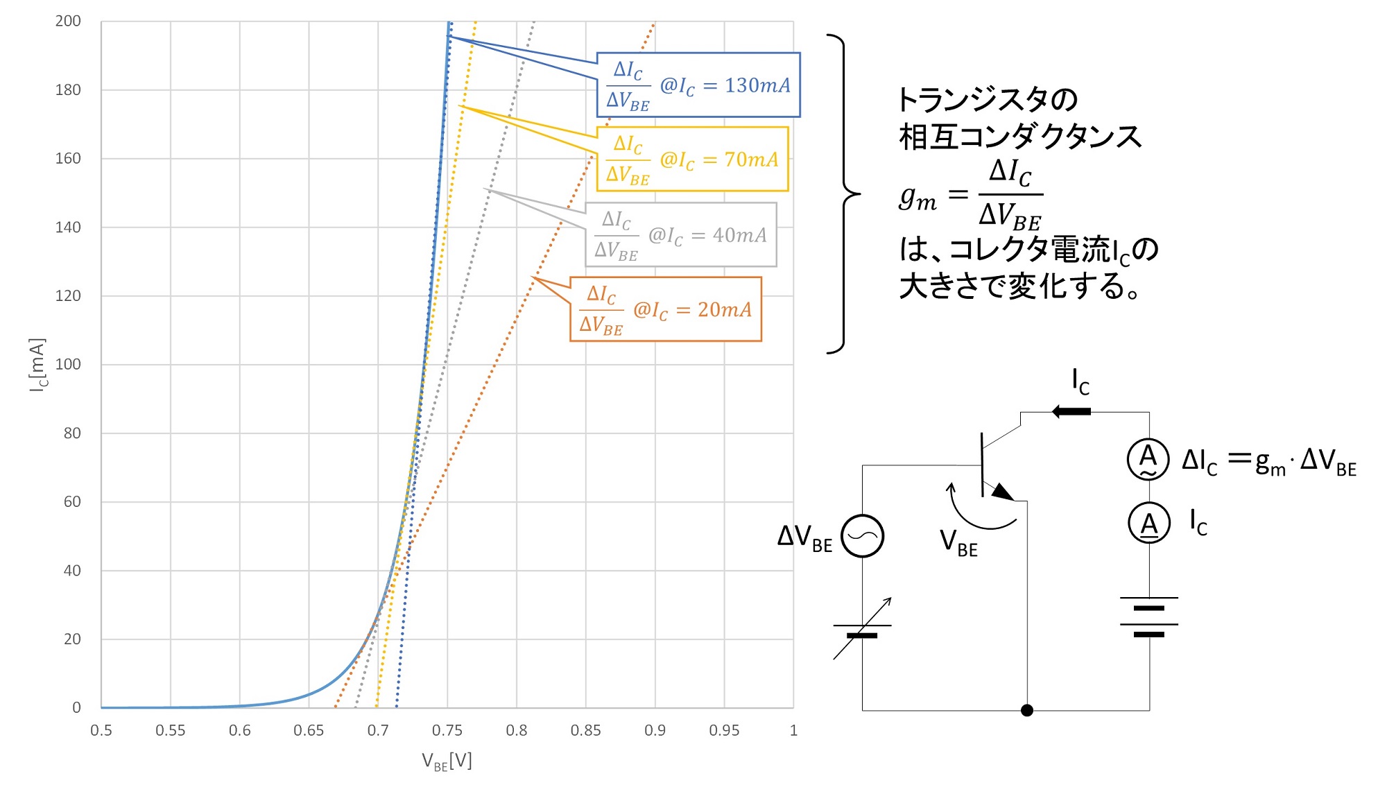これは、トランジスタのgmがコレクタ電流ICに比例するという特性によるものです。gmとは相互コンダクタンスの事で(式1-1)に示す通り、VBEの変化に対するICの変化の割合を示します。電圧/電流なので抵抗の逆数つまりコンダクタンスであり、単位は[S](シーメンス)です。