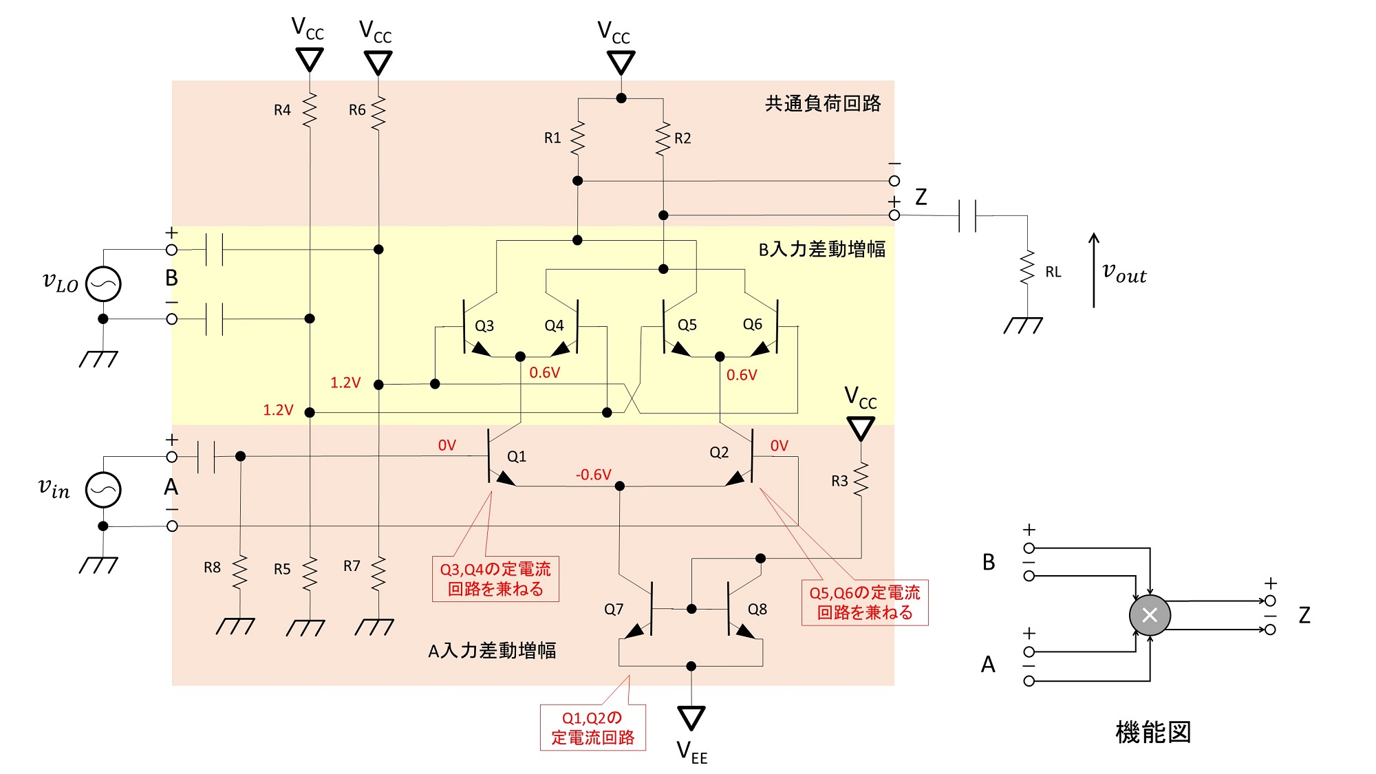 第9話で差動増幅回路の解説を行った時は、負電源VEEと定電流回路を用いる事で、ベース側にバイアス電圧を加える必要はありませんでしたが、ギルバートセル回路は、A入力差動増幅回路とB入力差動増幅回路が電源に対して直列に接続されたような構成になっているので、負電源VEEを用いていても、B入力差動増幅回路のトランジスタを増幅器として動作させる為には、ベース端子に直流バイアス回路が必須となります。図4では、バイアス回路設計の目安とすべき、トランジスタの各端子の電圧を赤文字で示しました。