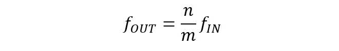 図4では基準クロック信号: 𝑓1=2.4576MHz、チャネル周波数間隔: 𝑓d=4.8kHzで、433MHz帯の無線通信で使用するキャリア信号を生成する事を想定した例です。周波数ステップ4.8kHzで出力周波数を変化させるためには、PLLの比較周波数: 𝑓dを4.8kHzにする必要があるので、入力された基準クロックは基準分周器(mカウンタ、もしくはRカウンタと呼ばれます)で1/512に分周されて位相検波回路(乗算器)に入力されます。これを分周フィードバック型のPLLで逓倍するわけですが、図4の例では90211+n倍(n=0,1,2,3・・・)に逓倍しています。結果的にこのタイプのPLLの入力周波数: 𝑓Iと出力周波数: 𝑓OUTは(式4-1)に示す関係になります。