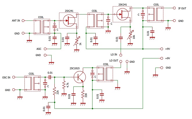 図1のような回路としました。50MHzで良く使われる平均的な回路で、目新しい部分が無いようにしています。RFアンプとミキサーには2SK241をイメージしていますが、ソケットを使っていますので他のFETでも試す事ができます。IF部と同様ですが、コイルと同調用のコンデンサもソケットにしました。従って交換が容易ですので、一応オールバンドに対応できる事になります。