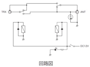 DC12Vの通電時には無線機側とアンテナ側の端子が接続される。またアンテナ側の端子部でアレスターが接続されており、静電気や誘導雷などから無線機を保護している。