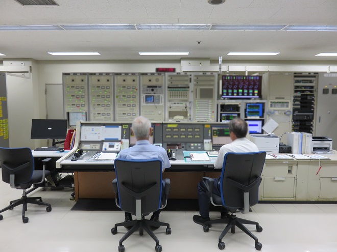 全体を見渡せる場所から管制室へ。ここでは24時間365日常時2人態勢で送信状況の監視をしている。プログラムされた放送が正しく送信されているか、送信地域と使用するアンテナが正しく切り替えられているかなどを監視している。