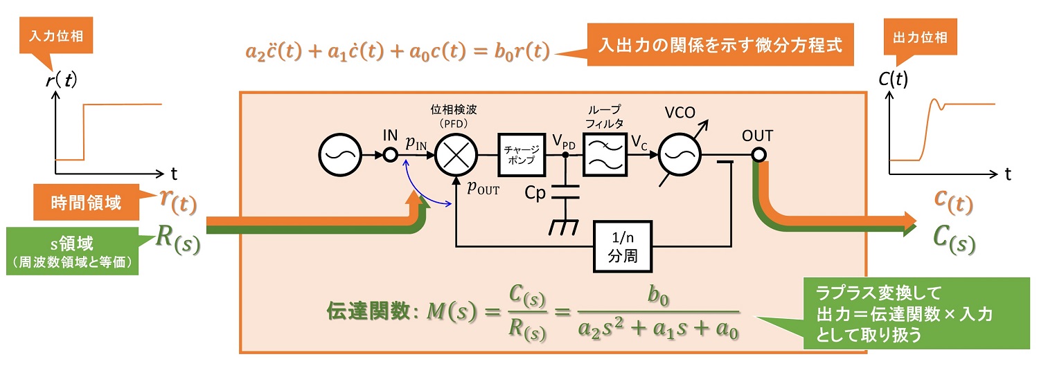 図1において、PLLに周波数設定変更などの制御を行った時の入力r(t)の変化と出力応答c(t)の関係は微分方程式で表現され、一般化すると(式1-1)で示されます。