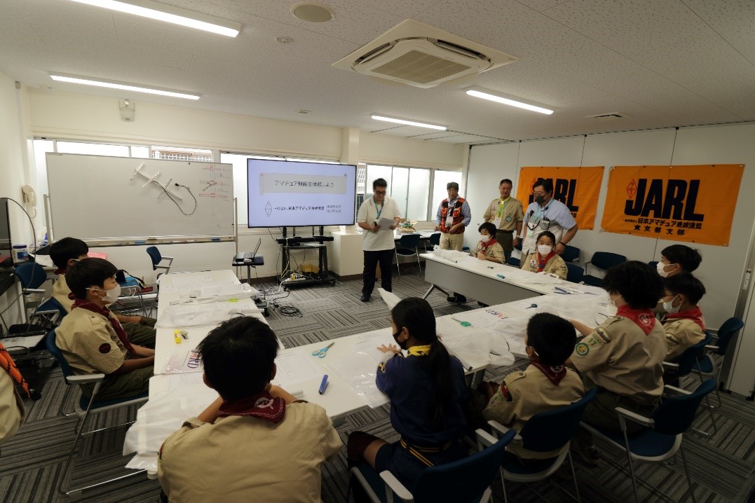 工作と電波教室の後は、いよいよ約45分間のアマチュア無線の体験です。前年までの特別局(8J1JOTA)ではなく、制度改正により今年は日本ボースカウトアマチュア無線クラブ東京の社団局JH1YSSを常置場所で体験局として運用しました。