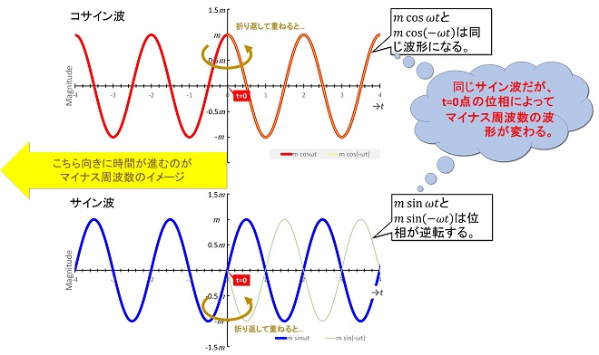 サイン波を文字通り「m sin ωt」と捉えると、 「m sin (-ωt )」は 「m sin ωt」の逆相信号、 つまり「m sin (ωt +π )」と等しく見えます。 これに対してサイン波を「m cos ωt」と捉えると、 「m cos (-ωt )」は 「m cos ωt」の同相信号、つまり同じ信号に見えます。ここで二つの疑問が浮上します。