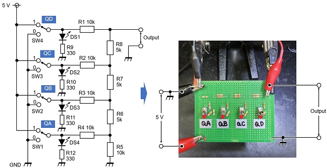 The D/A conversion circuit shown in Figure 3 with an LED to indicate "1" is shown in Figure 4 (right). This is added to a D/A conversion circuit with 24 (=16) different signals from 0000 to 1111 made with the resistor ladder, and the output is measured with a voltmeter.