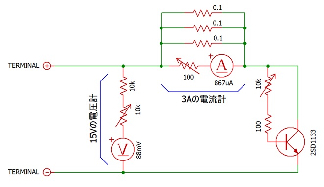 このようにして、最終的に回路は図4のようになりました。倍率器の部分を含めて15Vの電圧計であり、分流器の部分を含めて3Aの電流計です。従って、15Vと3Aの電流計を使うとスッキリし過ぎた回路になります。