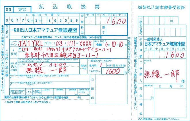 「JARL NEWS」2024年秋号(10月発行)に綴じ込まれている専用の加入申込票に記入して郵便局の窓口へ持参し、保険料を振り込む