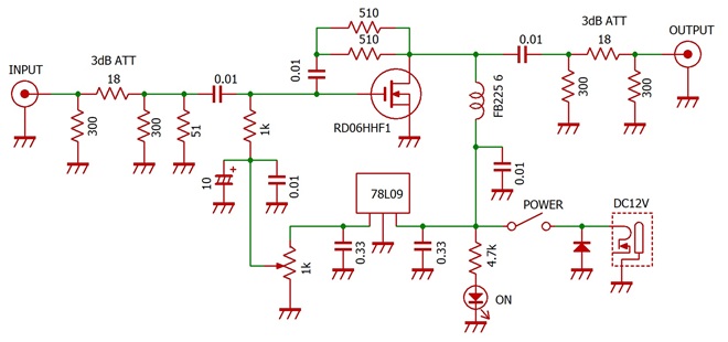 図1のような回路としました。RD06HHF1を12Vで動作させ、NFBをかけてほぼ平坦なゲインとしています。効率は悪いのですが、それは仕方ありません。電力的には、まだ多少の余裕はありそうです。