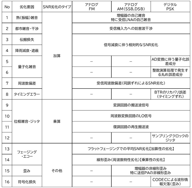 第8話では話を簡単にするために、明示的な解説を避けてお話ししましたが、足し算される雑音には「重畳」、かけ算される雑音には「乗算」と言葉を使い分けていました。第8話の図5~7に登場する劣化要因(等価雑音)を“足し算”か“かけ算”かの観点で整理したものが表1です。本表の「劣化要因」の列は第8話の図5~7の各表の最左列に書かれた劣化要因をマージした上で、等価雑音が主信号に「加算」されるケース、「乗算」されるケース、および「その他」のケースに分類して並べ替えて記載しました。