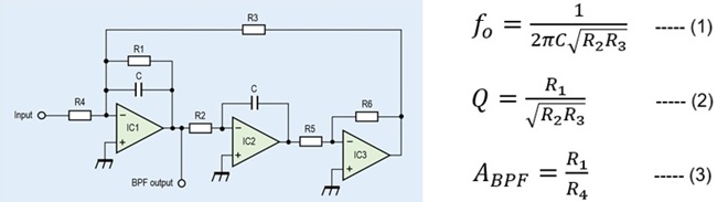 ブレッドボードに組み込んだ回路の特性を確認した結果は、その1で説明していますが多くの資料や文献で説明されているとおり、通過信号の周波数f0や通過帯域幅を示すQは、BPFの持つゲインとは独立して設定できることが分かりました。これらは、図2に示す式(1)~(3)からも確認できます。