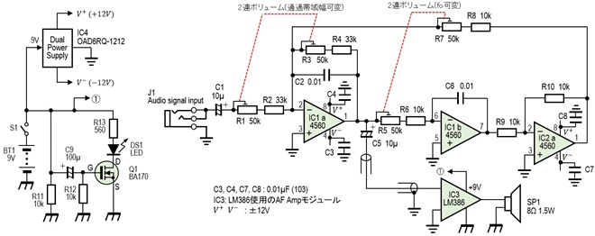 IC1、IC2で示す回路は、その1で示したバイクワッド型BPFです。R5とR7は50kΩの2連ボリュームを使っています。R5あるいはR7のいずれかを可変させることで通過信号の周波数を可変することができますが、大きく変化させたいことから2連ボリュームとしています。通過帯域幅を示すQは、R3で可変します。