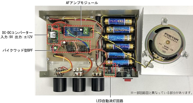 今回製作するアクティブBPFは小型の短波ラジオに接続することを目的としているため、できるだけ小型化を図り、かつ持ち運びもできるように乾電池仕様としています。そのため、内部には乾電池6本とスピーカーも組み込んでいます。