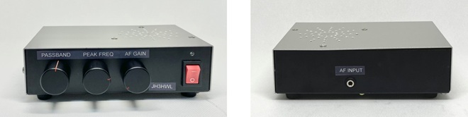 IC3はLM386を使ったAFアンプモジュールです。これも一から回路を組まずにモジュールを使い、製作時間の短縮を図っています。IC1の1番ピンから出力されるBPFの出力信号レベルはイヤホンを鳴らす程度ですので、後段にはこのAFアンプを接続し、スピーカーをドライブしています。Qを可変するとBPF全体の利得も変わることから、このAFアンプで出力レベルを調整することができます。