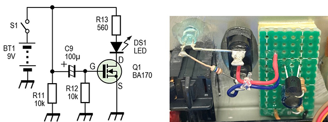 図8. 左: LED自動消灯回路 右: LED自動消灯回路をPCBに組み込んだところ