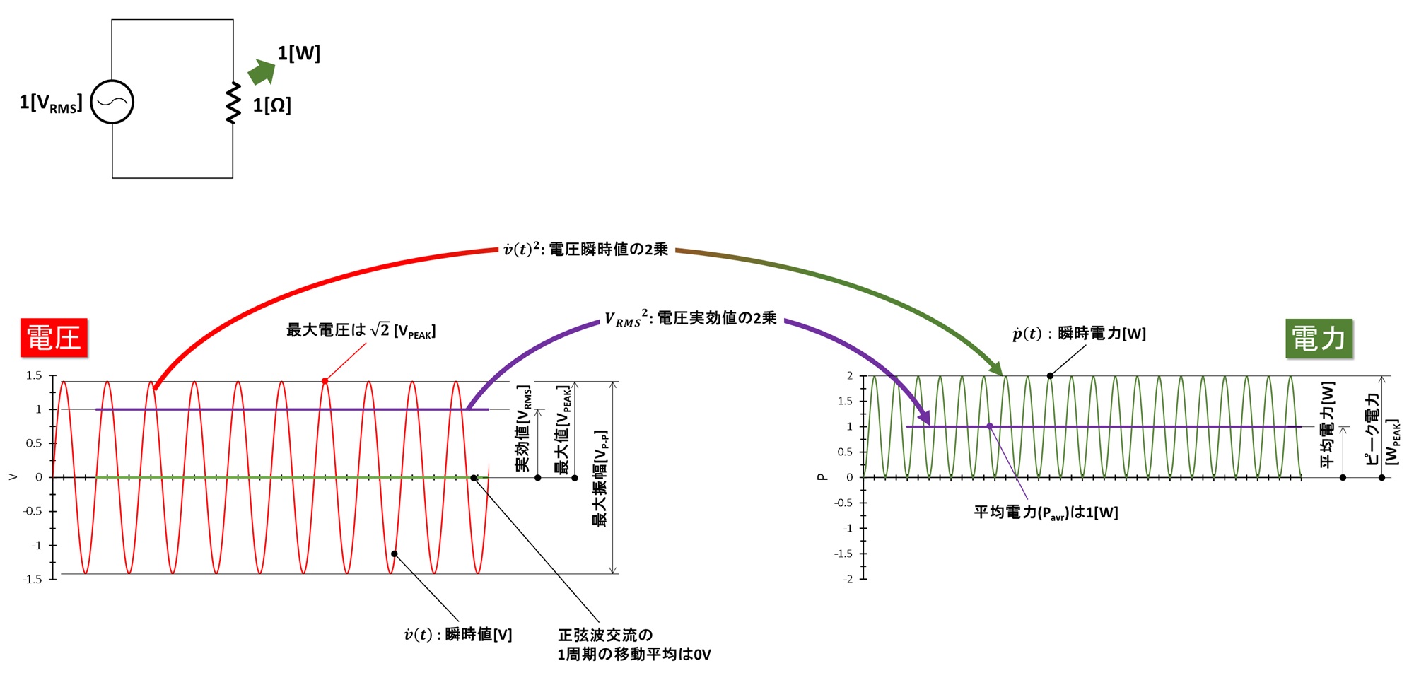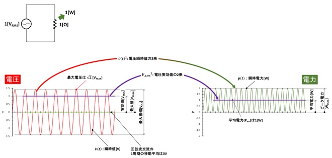 交流電圧には「平均電圧」の定義※1も存在しますが、ここでは敢えて省略しました。何故かというと交流電圧(電流)は正負が対称になる振動なので、1サイクルの平均値は必ず0[V]になるからです。一方で電力には「平均電力」が存在します。ここで負荷抵抗R=1[Ω]とおくと、電圧と電力