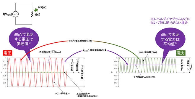 信号の世界では、交流電力の表記にデシベル(dBm)を用います。dBmは瞬時電力、ピーク電力、平均電力の何れにも適用するので読む側で注意が必要です。レベルダイヤグラム上で「信号レベル」として使用される「dBm」は平均電力を示します。従って第4話の表1で解説したようなdBmから換算したdBμVは平均電力と紐付けされる必要があるので実効値ということになります(Vlog[dBμV]=20logV[μV]の定義なので、そもそも電力換算値だと考えるべきです)。実効値以外の電圧にもdBμVが適用されるケースがありますが、この場合は電力のdBに換算できない(換算しても意味が無い)ケースが存在しますので注意が必要です。