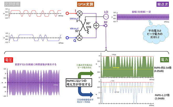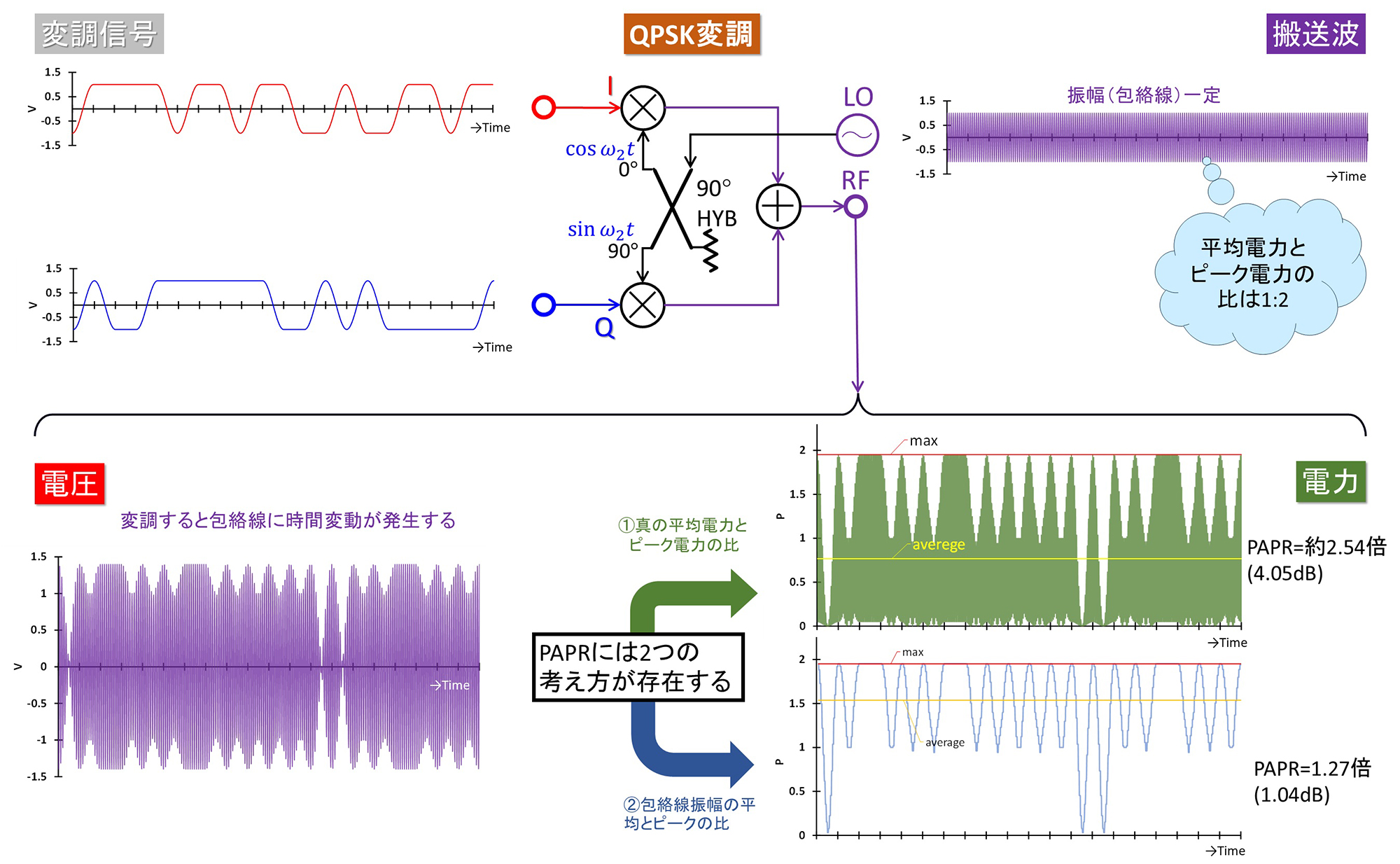 “①”の定義は読んで文字のごとくなのであまり違和感がないと思います。(式1-2)に示したとおり、無変調の正弦波の平均電力の値はピーク値の0.5倍なのでPAPRは3dB、QPSK,QAM等の変調波や周波数の異なるサイン波の集合体はこれより大きな値になります。“②”は変調された信号そのものではなく、変調された信号の包絡線の平均電力とピーク電力の比を示すもので、ピーク電力は“①”と同じ値をとりますが、平均電力は無変調交流の最大値と等しくなります。 これは無変調の正弦波や定包絡線変調(FMやFSK)のPAPRを0dBとおきたい時に用いる定義で、世間一般にはこちらが主流のように見えます。あまり区別せずに使用されているようですが、両者の間で3dBの隔たりが生じるので注意が必要です。
