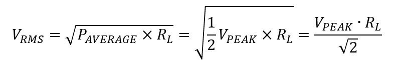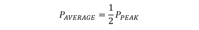 正弦波交流の場合、1サイクルの平均電力PAVERAGE とピーク電力PPEAK は三角関数のべき乗公式から、(式1-2)に示す関係となります。