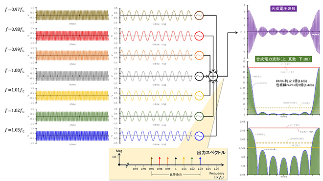 通常、振幅変調に起因するPAPRの上昇は3dB程度の範囲に収まりますが、この程度で済まないケースが複数のサイン波をまとめて1つの信号と見なして増幅する場合です。これには「共通増幅器」と呼ばれる複数チャネルの送信信号をまとめて増幅するケースとOFDM信号のように、そもそも周波数分割で多重された変調信号を扱うケースが考えられます。無相関の複数のサイン波を複数合成すると長い周期で位相が揃うケースが発生し、同時に多数の信号が同相になると非常に大きな振幅に達するため、PAPRが10dB以上の大きな値に達します(図5)。