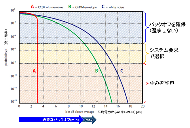 このような信号を取り扱う通信機においては、発生確率が極端に低いピークについては歪む事を許容し、結果発生する伝送誤りは、再送処理や誤り訂正などで救済するという考え方を採用し、アナログ増幅器のバックオフとして、発生確率10-5~10-8程度のピークが歪まないような値を採用するケースが一般的です。