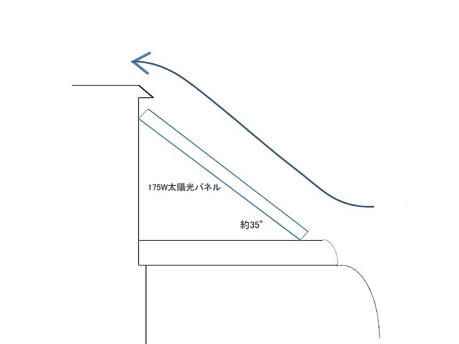 小さなパネルでは図のような空気の流れになり、パネル上部とシャック屋根との高さの差のある部分やパネルの前部分などで空気抵抗が発生しているのではないかと想像しています。