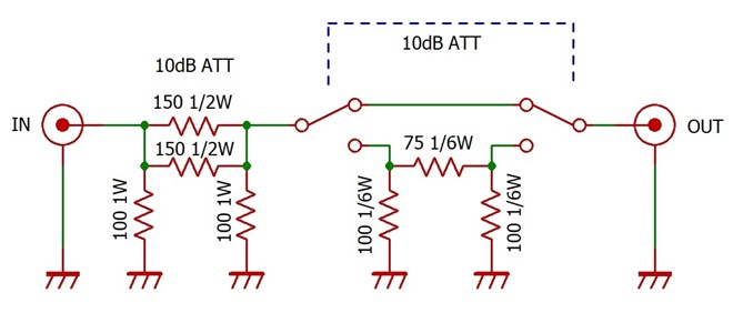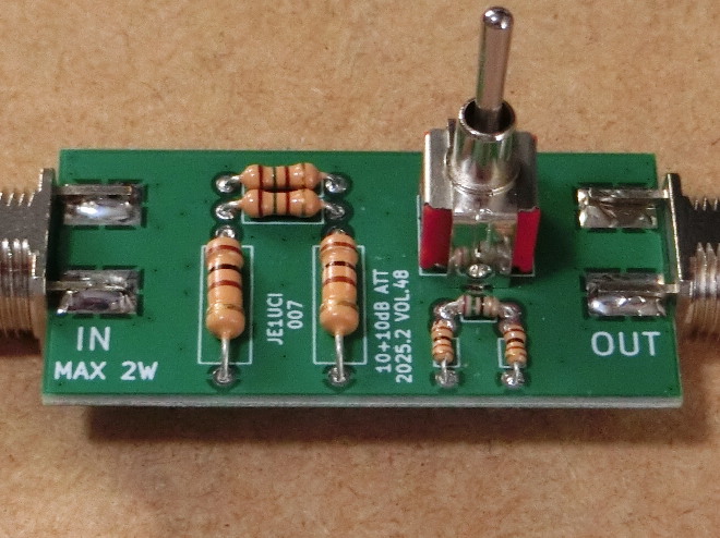 そこで作ったのが、写真2のような10+10dBアッテネータです。つまり、10dBの固定とON/OFFのできる10dBを組み合わせました。合計20dBのアッテネータになります。1段目のアッテネータは1Wの抵抗を使っていますので、計算上の最大入力は1.9Wになります。トグルスイッチでON/OFFするようにした2段目は1/6Wの抵抗ですので、こちらの方は余裕があります。基板にMAX 2Wと表示しているのですが、2Wは短時間と考えて下さい。基板に表示がありますが、写真2の左側が入力側になります。INとOUTを反対にしてもアッテネータは同じですが、耐電力は極端に少なくなります。1W程度の送信機の自作をしていると、このアッテネータだけで概ね済むはずです。TinySAでは10dBを一段追加するのが良いかもしれません。