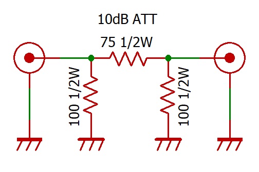 くどいようですが、この程度のアッテネータが10Wや100Wに耐えられるはずがありません。また、20dB程度の減衰量ではスペアナも過大入力になります。抵抗は燃えるしスペアナも壊れる可能性があります。このようなミスは、自己責任です。