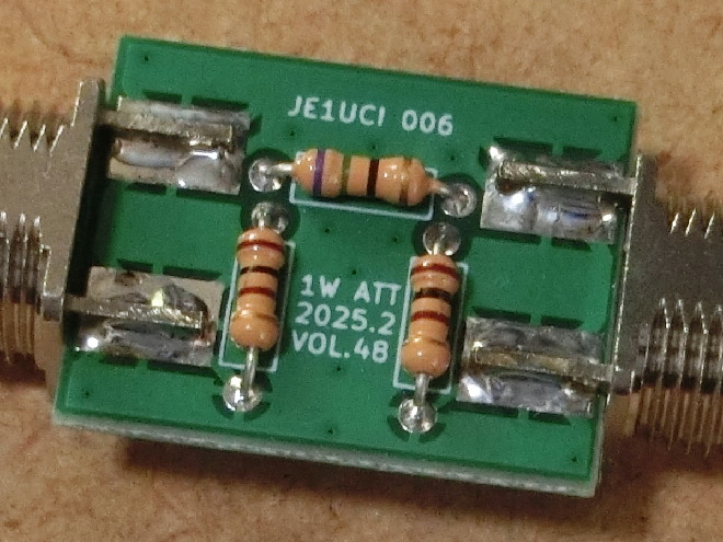 基板を組み合わせた中で、写真3のような固定値用も作りました。このようなアッテネータも作りたかったのです。一応10dBの固定値としています。ここには、1/2Wの抵抗を使っています。10dBとする場合は0.95Wのアッテネータになります。1Wの連続は避ける方が良いでしょう。但し、入力側と出力側のインピーダンスのズレによって、消費電力は変わります。絶対に大丈夫という計算ではありません。基板としては、どちらを入力側にしても同じです。