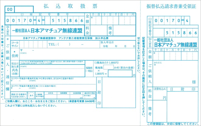 機関誌「JARL NEWS」2025年秋号(10月発行)に綴じ込まれている専用の加入申込票に記入し、郵便局(ゆうちょ銀行)から保険料を振り込み(送金手数料は申込者負担)。