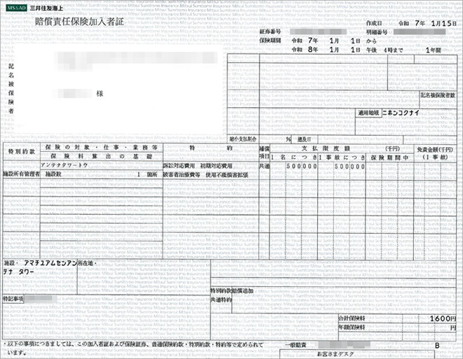 JARLの「アンテナ第三者賠償責任保険」の加入申し込みを行うと、翌年の2月頃に代理店から加入者証が郵送されてくる