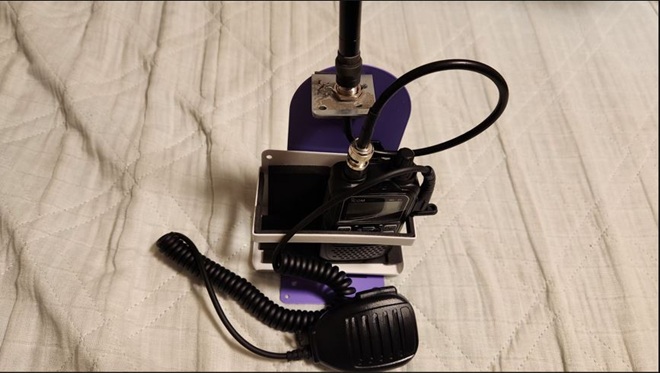 そんなことで、変更審査が終わるまでの待ち時間で、常置場所やホテル移動運時に使用するためのハンディー機用スタンドを製作しました。材料は100均グッズで鉄製の調味料入れやブックエンドを活用しました。調味料入れのハンディー機に接する部分にはシール付きのスポンジを使い養生を行い、調味料入れとブックエンドの合体はマグネットシールを使用しました。また、建設資材のLアングルでアンテナ基台を製作しました。ケーブルはBNC付のRG-58ショートケーブル30cmです。