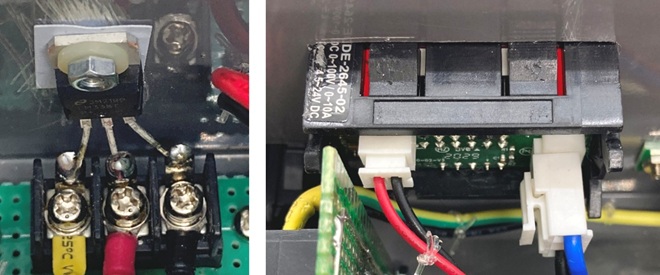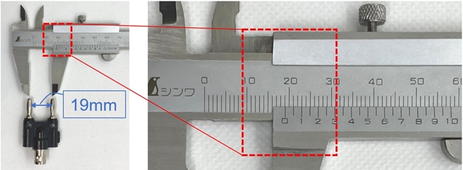 図9. 赤黒出力端子間を19mm間隔で取付けるとバナナチップのコネクターが使えるので便利
