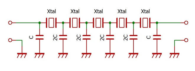 5素子のラダー型フィルタとして、図1の回路としました。押し込めば7素子も可能かもしれませんが、まあ最初ですので5素子で良い事にしました。今のところ私の作るものであれば、性能的に5素子で充分と思います。その方が性能的にバランスは良いのですが、今後は7素子も作ろうと思います。