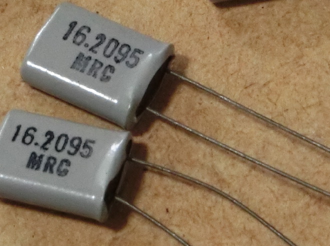 クリスタルは写真3のようなジャンクを使っています。これは図2で使用した16.2095MHzのクリスタルですが、足にひどい錆びがありました。このような場合、細かい紙やすりで磨いておく必要があります。錆が無いように見えても磨く方が良いでしょう。ハムフェアで入手したジャンクですので、このような手間は仕方ありません。磨かないとハンダ付けが全くできない場合もあります。