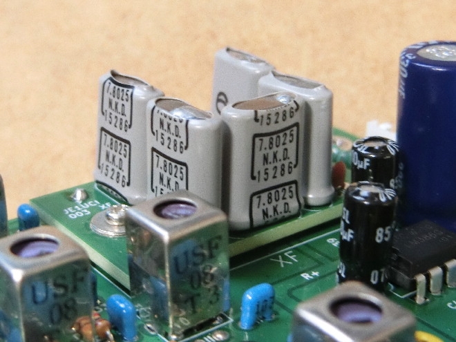 外注で作ったのが写真4の基板です。コンデンサはCについて2個までパラにできるようにしました。つまり2Cでは4個です。計算したコンデンサの値は、都合の悪い事も良くあります。そこで2個までパラ接続ができるようにしました。但し、サイズの都合もあって足の間隔は2.5mmとなっていますので、5mm間隔のコンデンサは使えません。もちろん2Cで4個にする必要はなく、図2のように合計で2倍の容量にすれば良いのです。