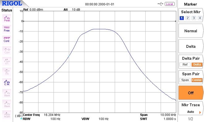 このようにクリスタルフィルタを3個作製しました。測定結果1は図2の回路で作った16.2095MHzのクリスタルフィルタの結果です。これは入出力インピーダンスが61Ωですので、ほぼ50Ωに近くなっています。リップルはありませんが周波数が高いためか少々切れが悪いようです。更にクリップで測っていますので、測定条件も良くありません。これは動作チェックだけの測定です。